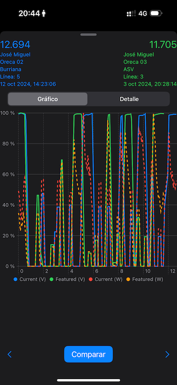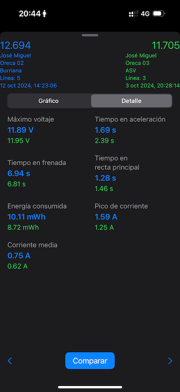 - Comparar vueltas o comparar pilotos: esto te permite conocer diferencias con otras vueltas y establecer puntos de aceleración, de freno y dónde se está perdiendo tiempo en cada vuelta.